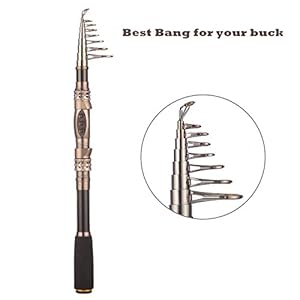 Perfect elasticity, high density Carbon fiber mixed with fiberglass make your fishing pole hard & durable. Stainless Steel Hooded Reel Seats is anti-seawater corrosion; EVA Fore Grip for comfort. The telescopic fishing rod is portable, and closed length design is convenient carrying around. Power: Medium; Extended Handle. -