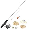 High quality 24″ rod, ball bearing reel with line. 10 pack of ice magic grubs and waxies, spring bobber, Pre-spooled graphite reel.