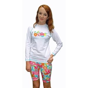 This girl’s SPF swimwear is a 2-piece set with long sleeve rash guard top and your choice of matching swim shorts.