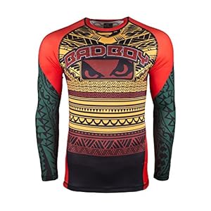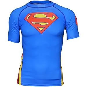 This rashguard features a red and yellow emblem on the chest with the letter “S” in a shield shape to replicate Superman’s suit