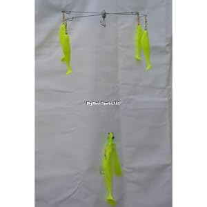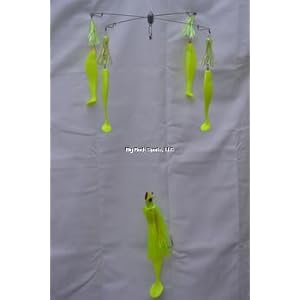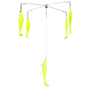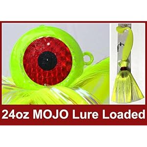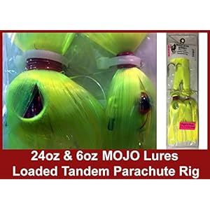 Blue Water Candy – Rock Fish Candy 24 oz Cannonball & 6 oz Grinning Gus Mojo Lures Loaded with 9-Inch Swimbait Shad Bodies Tandem Parachute Rigged & Ready (Chartreuse)