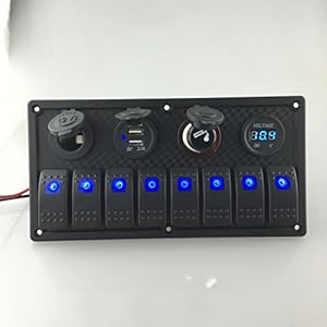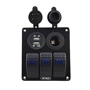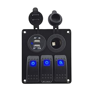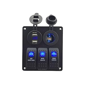 3xLED illuminated Rocker Switch (3 pins on-off)with rubber seals.With DC12V/24V power socket and 5V 3.1A USB and DC12V/24V blue led voltmeter.