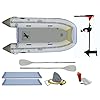 Comes with: 40lb Thrust Trolling Motor, Air Mat Floor, Two Sea-Worthy Anodized Aluminum Oars, Foot Pump, Two Marine Grade Plywood Seats and Repair Kit