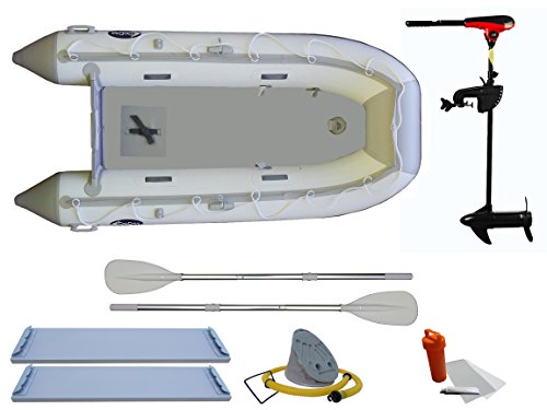 RibRave 10ft 6in Foldable Boat comes with a 40lb Thrust Trolling Motor, Air Mat Floor, Two Sea-Worthy Anodized Aluminum Oars, Foot Pump, Two Marine Grade Plywood Seats and Repair Kit