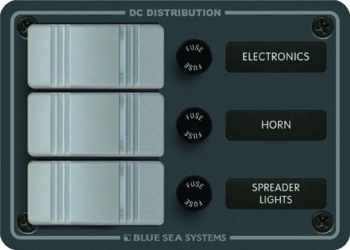 Water-resistant switch panel, Mfg# 8054, is composed of 3 illuminated contura switches with front-fixed FUSE holders for AGC glass fuses (no longer included). 12 or 24 volt DC. Vertical Orientation, 5.25″W x 3.75″H. Dark gray colour with gray switches.