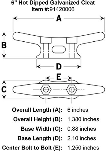 6″ Heavy responsibility sizzling dipped galvanized rope cleat with bolt holes and hexagon recess to make use of with hex head bolts. Can be utilized for dock or deck in saltwater or freshwater packages. Really helpful bolt measurement to make use of: 1/four”