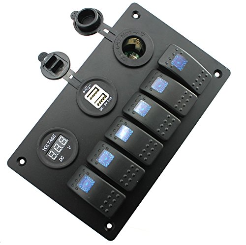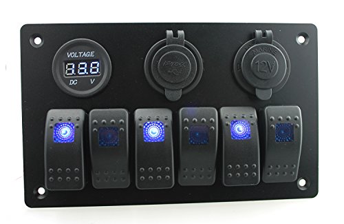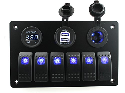 Ambuker DC12V/24V Waterproof 6 Gang Rocker Switch Panel with blue voltmeter Cigarette Socket Double USB Power Charger Adapter sticker labels and fuse holder for boat marine RV truck trailer car