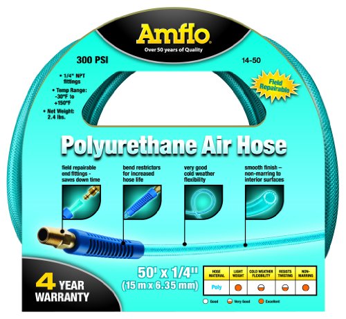 The Amflo 14-100 blue polyurethane air hose has a 1/4″ ID and is 100 ft. long. Its blue tube and cover are made of polyurethane, which has non-marring characteristics and provides resistance to weathering, abrasion, oil, and kinks. This hose provides both durability and flexibility at temperatures ranging from -30 to +150 degrees F. It’s reinforced with a nylon braid for the strength necessary to achieve and care for its maximum pressure rating of 300 pounds per square inch (psi), and comes equipped with two 1/4″ factory-installed, field-repairable, brass male National Pipe Thread Taper (NPT) swivel fittings with PVC (polyvinyl chloride) bend restrictors that reduce twisting and bending, increasing the life of the hose. This hose is manufactured as a lighter-weight alternative to bulkier rubber and plastic hoses to be used in contracting and industrial applications.