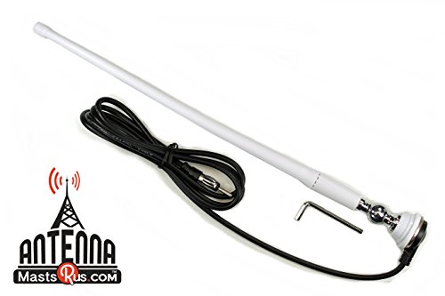 It is a “BRAND NEW” VERY HIGH END 15″ MARINE WHITE RUBBER AM/FM ANTENNA. This AM / FM antenna is made for the marine application where the mast is constructed from rubber and yet it’s stiff enough so it’s going to not wobble around in rough seas. Mounting of this antenna may be designed for narrow applications so it may be mounted in as shallow of a area as 1 inch. The antenna is a total of 15″ tall including the base. The base has a high end chrome mount that may be adjustable to set at any angle, and comes with its own wrench to regulate it. The reception wire is 55″ long with an ordinary Motorola radio connector to plug into the back of all radios sold in the united states. So It is a Marine Quality AM/FM White Mast and White Base Antenna. Any questions or concerns on any of our products feel free to contact us by telephone or email by clicking on AntennaMastsRus about us page here on Amazon.