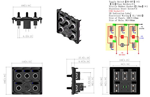 Bandc Marine Grade Boat 5 Way Toggle Switch Panel with USB Charge Socket Output 1a & 2.1a