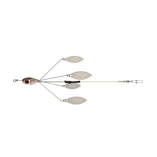 The Booyah Boo Rig utilizes the effectiveness of a schooling rig and a spinnerbait – all in one fish-catching package. Equipped with four lustrous willow blades at the end of four stiff wire arms, the Booyah Boo Rig gets down deep and delivers a blinged-out presentation that big bass just can’t resist. When fished with a wide-wobbling crankbait, the vibrations commute up through the wire, and give the willow blades even more action. Fish the rig that’s full of flash, the Booyah Boo Rig. The Boo Rig series from Booyah provides lures with the added weight necessary to go beyond their targeted running depth, and keeps them in the strike zone so long as conceivable. What’s more, the Boo Rig series uses a flexible nylon-encased wire that allows lures to swim like they’re attached straight to mono. And not they’re not meant just for fishing swimbaits either, the entire Booyah Boo Rigs can accommodate all manner of crankbaits, spoons, weightless swimbaits, and even jerkbaits.