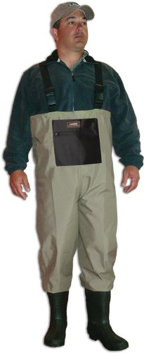 Comfortable taupe Boot foot breathable waders with adjustable suspenders, handwarmer pocket and aggressive knobby soles.