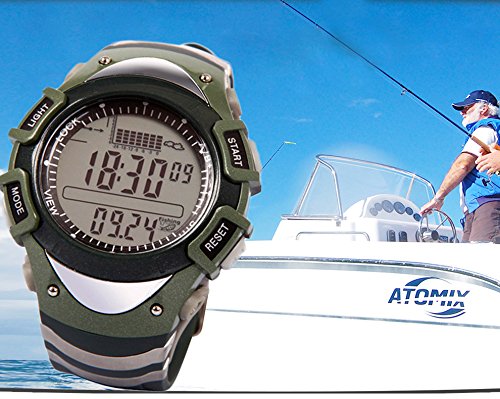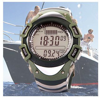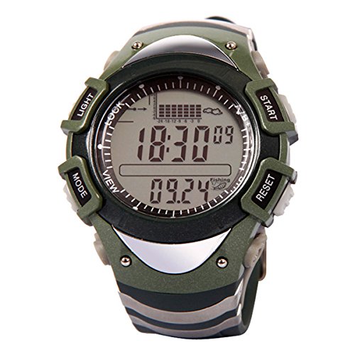 50m water resistant Fish Finder Watch. Army-Green Color. Fishing time remind function.pressure tracking function for 6 fishing places. MAKES FISHING EASY AND FUN!! GREAT AS A GIFT!! We try harder!!, Excellent Customer Service!!