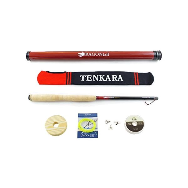 DRAGONtail Tenkara Shadowfire 12′ Tenkara Rod PLUS Complete Starter Package – Flies, Leader, Tippet, Line Holder, Storage Tube, and Rod Sock