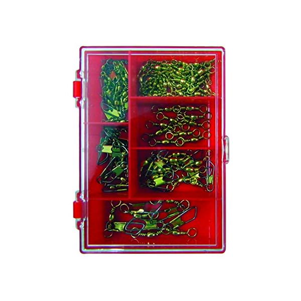 Eagle Claw freshwater swivel assortment – includes plastic case with 6 individual compartments – gold color swivels – assorted size barrel and snap swivels – for freshwater fishing – item #SWVLASST1 – UPC #147708746489.
