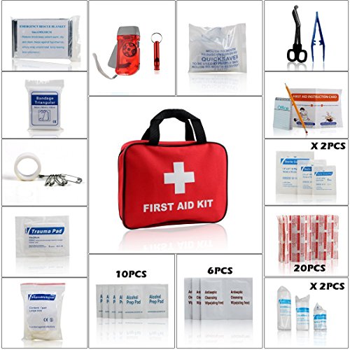 FAMILY EMERGENCY MEDICAL CARE:The first-aid kit (69 pieces) provides security for you and your family.Each of Kit mainly includes a Tourniquet, an emangency blanke, Disposable CPR mask,20 pcs Band aid ,whistle,Hand-pressing flash light, alcohol wipe plus a helpful First Aid Instruction manual for quick and easy solutions to emergencies.