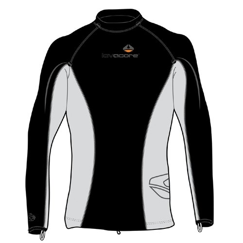 Lavacore is a technically advanced fabric, constructed and engineered exclusively for water sports requiring the ultimate in thermal control and superior comfort. This unique synthetic construction closely matches the stretch and movement of a traditional Lycia rash guard, while providing the insulation qualities similar to that of a neoprene wetsuit. Close to the skin, Lavacore’s soft internal fleece and high 4-way stretch produces the ultimate comfort-warmth-weight ratio, a true leader amongst any fabrics within the water sports industry. Wet or dry, hot or cold, Lavacore helps control your core temperature longer, whether worn as a standalone garment, or under your wetsuit or clothing. OUTER Lycia layer is a 6.35 oz./10.8 sq. feet (180g/sq. m) knitted nylon wrap knit Tricot with water repellant treatment to ensure fast water runoff and anti-wind chill properties. INTER layer is an impermeable breathable Micro-porous high stretch Polyurethane (PU) film which is wind proof and breathable allowing perspiration to be drawn away in hot conditions. INNER Fleece layer is a 8.47 oz./10.8 sq. feet (180g/sq. m) 4 way stretch polyester fleece with elastane. It has anti-pill treatment, as well as anti-microbial treatment to reduce odors and eliminate bacteria. Lavacore is neutrally buoyant so you won’t need to add weight to your weight system compromising your weight comfort zone. Full gusset incorporated into the underarms offer exceptiona