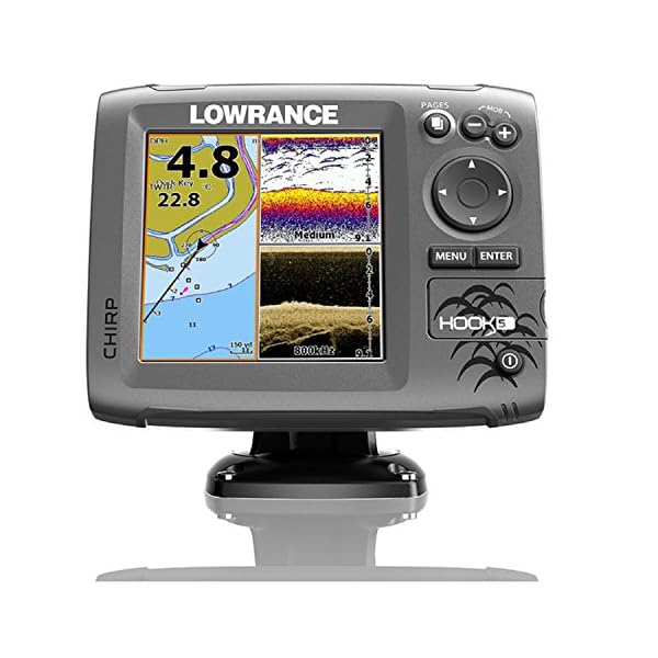 The Lowrance hook-5 is a Fishfinder/chartplotter that offers proven features at a great value without compromising the quality anglers have come to expect from Lowrance. The hook-5 combines the benefits of CHIRP sonar and DownScan Imaging technology to give you a clear and complete view of the underwater environment beneath your boat. It features enhanced sonar sensitivity, excellent target separation and superior noise rejection, making it easier to see baitfish and gamefish targets. With a built-in GPS antenna and proven navigation features, revisiting your favorite fishing spot is simple with the hook-5, whether you use the base map, optional high definition Chart upgrades, or your own Insight genesis custom maps.
