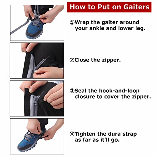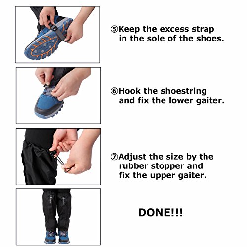 • Breathable water-proof and anti-dressed in fabric. Give protection to your shoes and pants from water, snow, rain, wind, sand and bug, also keep your legs warm.