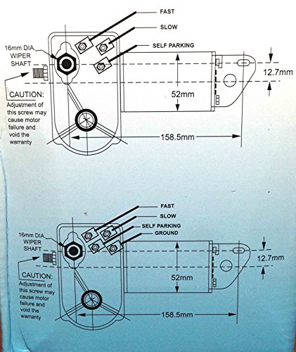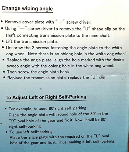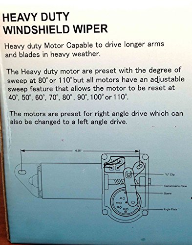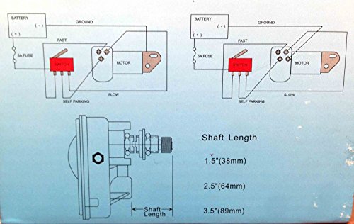 Factory preset sweep: 80 degrees Sweep angle will also be adjusted to 40, 50, 60, 70, 80, 90, 100 degrees and directions will also be found in pictures 5 and 6. Left or Right self parking feature will also be adjusted. Two speed wiper motors; Slow: 32-40 Sweeps a minute Fast: 52-60 sweeps a minute 12VDC Heavy Duty motor easily moves blade lengths between 16″ and 24″ Wiper Blades don’t seem to be included on this listing. Dimensions: Shaft Length: 2.5″ Shaft Diameter: 5/8″ Additional Features: – Corrosion-resistant casing -Solid brass knurled drive nut with brass and stainless-steel drive shaft Please see all our images for added instructions and installation diagram. Diagrams might be imprinted on the box of the thing itself. Item: P16652CE