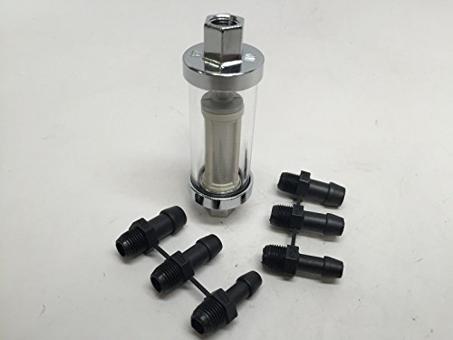 It is a Universal In-line Fuel Filter for 1/4″, 3/8″ and 5/16″ fittings/ diameter lines. The clear glass permits for visual inspection in order that it prevents dirt sediment from storing within the replaceable white mesh element.