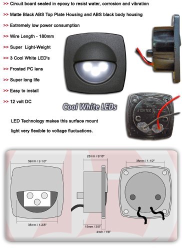 The tough ABS sleek black housing has a epoxy coated circuit board what makes this light waterproof, it is 2 ¼” x 2 ¼” and has 3 cool bright white LEDs.