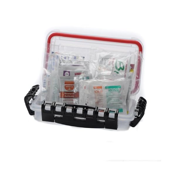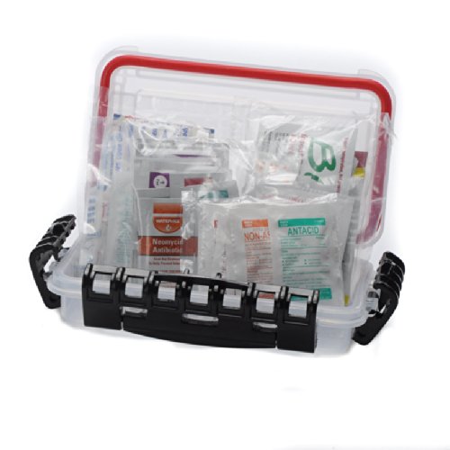 First aid supplies packed in a Water-proof storage box to be used on boats, Rv’s, personal watercraft or anywhere you will need to keep your first aid supplies clean and dry. Water-proof, utility storage box is has a Dri-loc, O-ring seal and three tight sealing cam-action latches to keep internal supplies dry. Water proof box is sufficiently small to slot in tight areas and is sturdy enough to get up to the trials of recreational commute.Tight sealing, clear utility box measures 7.38″ x 4.50″ x 1.75″. First aid products included on this kit; 2-Medi-Lyte Heat Relief Tablets, 2 Sunscreen Packets, 3 Lip Guard, 3 Sting Relief, 4 Antihistamine Tablets, 1 Ivy Cleanse Towelette, 1 Bug Repellent Towelette, 1 Sunburn Gel, 3 PVP Pads, 3 Antibiotic, 3 Alcohol Pads,3 First aid Burn Cream, 3 Hydrocortisone packets, 3 Antiseptic Wipes, 4 Non Aspirin Tablets, 4 Ibuprophen Tablets, 4 Antacit tablets, 4 Pain Relief Tablets, 2 Sinus tablets, 5 Jr bandages, 3 spot bandages, 5 Fabric bandages, 5 plastic bandage strips, 3 fingertip, 3 knuckle bandages, 2 motion sickness tablets.