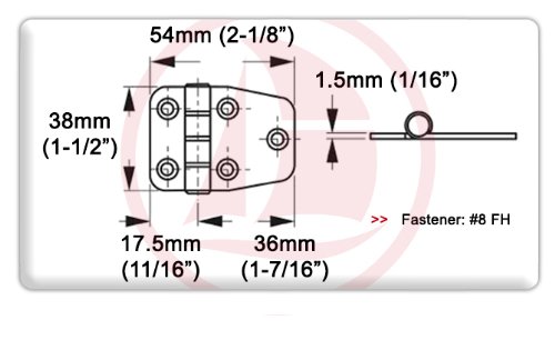 Polished door hinge – Thick glance. 74mm x 38mm. polished door hinge. 38 x 56 mm; calls for 6 fasteners each and every. 5 Oceans´ thick glance door hinge, quick facet, product of polished chrome steel.