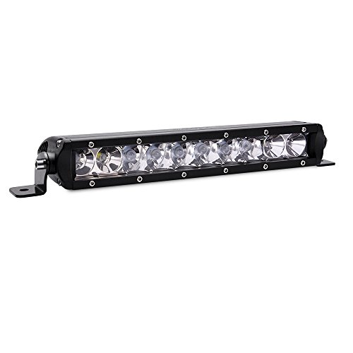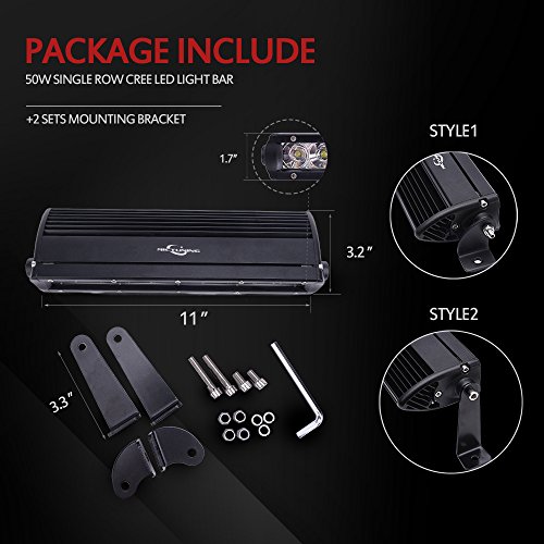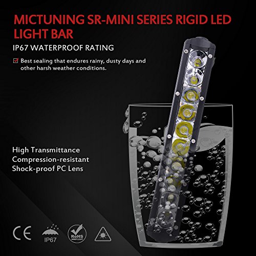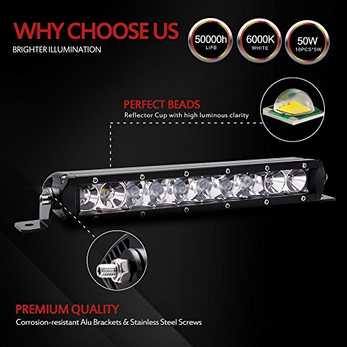 This MICTUNING SR-Mini Series 11” 50W Single Row CREE LED Light Bar made of durable corrosion-resistant diecasting aluminum housing and toughened glass lens,with 10pcs*5W high intensity LEDs, Spot 10 degree & Flood 20 degree Combo Beam,saving more energy, efficient and so forth.Operating Voltage is 10-30V DC,5000 lumens , more than 50000 hours life span.This is a highest aftermarket led light for off road.Upgrade the original light to your vehicle and worry-free concerning the darkness, rain and fog weather.