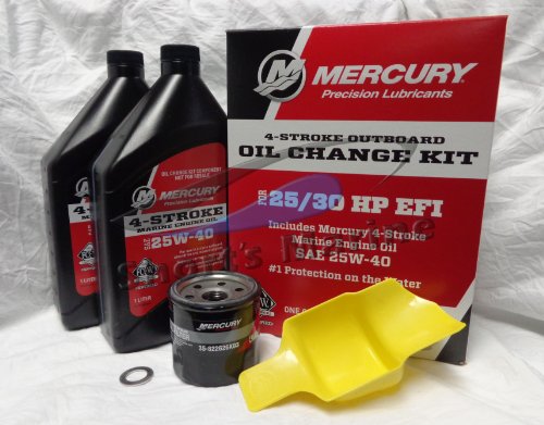 Mercury Marine 25/30 hp 4-Stroke EFI Oil Change KitMercury oil change kits contain industry-leading Mercury 25W-40 Marine Engine Oil. Over five years of engineering and development went into the exclusive Flagship Protection formula which features a high-tech, advanced set of anti-wear additives that provide up to 35% better camshaft wear protection and the highest levels of corrosion and oxidation protection. Designed to care for engine reliability and performance, Mercury 25W-40 Marine Engine Oil has been proven to hold its viscosity ratings longer in industry wear testing than other oils available on the market. Mercury Oil, combined with a genuine Mercury Oil Filter team up to give you the #1 protection on the water.Industry Leading Strength – Mercury provides the most lasting, strongest protection.Flagship Corrosion Resistance – New advanced corrosion inhibitors outperform competition and all industry standards. Provides protection against rust and corrosion in wet environments and throughout off-season storageUltimate Wear Protection – The usage of new, high-tech additive technology, Mercury has 33% greater camshaft wear protection compared to other marine dealers.Each kit contains the entire items needed to change oil in make a selection Mercury 4-Stroke Outboards: (2) 25W-40 Marine Engine Oil (1) Oil Filter – 822626K03 (1) Drain Plug Seal – 895146 (1) Drip Tray 8M0052100 Complete instructions printed right on the boxCheck engine oil and replace oil filter every 100 hours of use, or yearly (whichever comes first).InstructionsMercury Oil Change Instructions for 4-Stroke 25/30 HP EFIOil Change Procedure Tilt the outboard up to the trailer position. Turn the steering on the outboard so that the drain hole is facing downward. Remove the drain plug with an 18mm wrench and drain the engine oil into an appropriate container. Place new seal on the drain plug and lubricate with oil. ReinstallChanging the Oil Filter Place a rag or towel below the oil filter to soak up any spilled