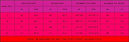 Asian Size S: Waist(cm/inch): 62/24.8; Hip(cm/inch): 96/38.4; Recommend For Hight(cm/inch): 163-168/65.2-67.2; Recommend For Weight(kg/lb): 60/132