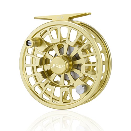PISCIFUN Reels has always stood for quality fly reels at a reasonable price. The frame and spool of the PISCIFUN BLAZE Fly Reel are cold-forged and CNC-machined aluminum for unyielding hardness and rigidity. A super-smooth in-line disc drag system assures even pressure to protect light tippets. Gold hard-anodized finish offers protection from the elements Concave arbor for greater strength and capacity ; Includes drawstring bag; No tools necessary to convert between right- or left-hand retrieve.