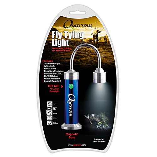 Quarrow Fly Tying Light has 70 Lumens of bright white light. Hands free directional lighting with glow in the dark on and off buttons, water and impact resistant.
