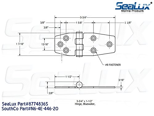SeaLux Marine Surface Mount Hatch Door Hinge with Massive Leave and Medium Hatch; Stamped hinge construction, Replicate Gloss Polish End adding luxury glance to application; Max. static load:120 lbs. Helpful for plenty of Trade applications. Mounting Screws don’t seem to be provided, Require Install hinge with M4 or (8-32) CSK . Size: 3-3/4″ x 1-1/2″ ; Sold as A PAIR; Hole pattern refer to picture for detail; Compatible for SouthCo Phase#N6-4E-446-20 or N6-4E-446-24 Use on Trade Applications • Electrical Equipment/Switchgear • HVAC – Heating/Ventilation/Air Conditioning • Industrial Machinery • Marine • Off-Highway – Construction, Farm Vehicles