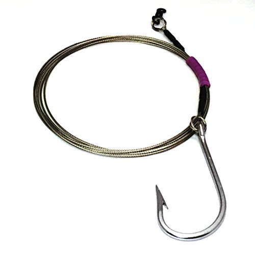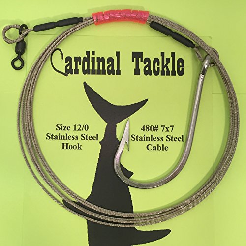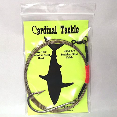 This Listing is for our 12/0 stainless steel big game hook shark rig (480# test, 7×7 49 strand construction bright stainless steel cable). Our shark rigs are 10 feet long, made from 49-strand stainless steel cable, and double crimped with brass sleeves to a stainless steel big game hook and 4/0 Rosco Brass Swivel. The 10 ft length keeps most sharks far enough away from your mainline but is manageable enough at the side of the boat. Like all of our rigs, each one is made by hand in the USA. A key feature to all Cardinal Tackle Shark Rigs is the protected connections. After double-crimping the hook and swivel, we cover it with a short length of heat shrink tubing. The heat shrink tubing: (1) in the event of a tangle or crossed liens, it prevents frayed ends of shark wire cutting up your monofilament | (2) helps protect your hands when leadering or even just changing baits | (3) less damage to soft baits if you bury the hook | (4) cuts down on nasty pieces of old bait fish stuck to your rig if you have to put it away for another trip. Each rig comes with an EZ Curl Wrap and a strong usable ziplock bag in case you get it back.