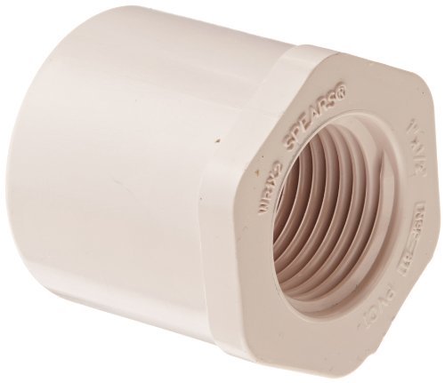 This Spears 438-UV series UV-resistant schedule 40 PVC bushing fitting has a spigot connection on one end and female NPT threads on the other, and is suitable for connecting two pipes with different ends in applications where the fitting is exposed to sunlight. The National Pipe Taper (NPT) threads create a tighter seal than straight threads, and the spigot end has the same diameter as the pipe it connects to, minimizing turbulence and creating a tight seal. This bushing fitting is made of UV-resistant PVC (polyvinyl chloride) for chemical and corrosion resistance, high strength, and no more weight than fittings made from metal. It may be used in applications where it is exposed to sunlight, which can degrade the have an effect on strength of unprotected PVC. It is compatible with schedule 40 PVC pipes and fittings and is suitable for cold-water pressure distribution systems including irrigation, pool and spa, potable water, and chilled water applications. PVC can also be connected to other materials such as steel, copper, or cast iron the usage of transition fittings. The fitting has a maximum operating temperature of 140 degrees F, meets ASTM International D1784 and D2466 standards for quality assurance, and is certified by National Sanitation Foundation International (NSF) for potable water service. This UV-resistant schedule 40 PVC bushing fitting is suitable for connecting pipes for conveying drinking water, waste water, chemicals, and other liquids in a range of industries.