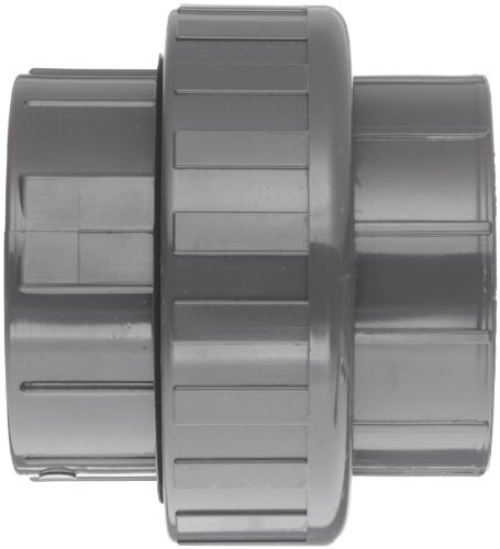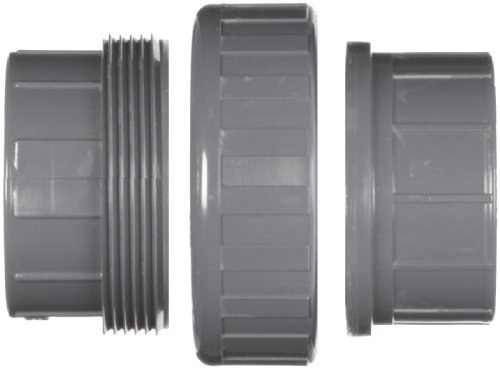 This Spears schedule 80 PVC union fitting has female NPT threads on both ends, and is suitable for connecting two pipes. The National Pipe Taper (NPT) threads create a tighter seal than straight threads. The fitting has three pieces and includes a threaded connection that may be screwed or unscrewed to connect or disconnect pipes more easily than with couplings. It is made of gray PVC (polyvinyl chloride) for chemical and corrosion resistance, high strength, and no more weight than fittings made from metal, and has an EPDM (ethylene propylene diene monomer) seal for resistance to oil, water, and some solvents. It is compatible with schedule 80 (thick wall) PVC pipes and fittings, and is suitable for chemical processing, industrial plating, chilled water distribution, deionized water lines, and chemical drainage and wastewater remedy systems. PVC can also be connected to other materials such as steel, copper, or cast iron the usage of transition fittings. The fitting has a maximum operating temperature of 140 degrees F, and a maximum operating pressure of 235 pounds per square inch (psi) at 73 degrees F. It meets ASTM International D1784 and D2467 standards for quality assurance, and is certified by National Sanitation Foundation International (NSF) for potable water service. This schedule 80 PVC union fitting is suitable for connecting pipes for conveying drinking water, waste water, chemicals, and other liquids in a range of industries.
