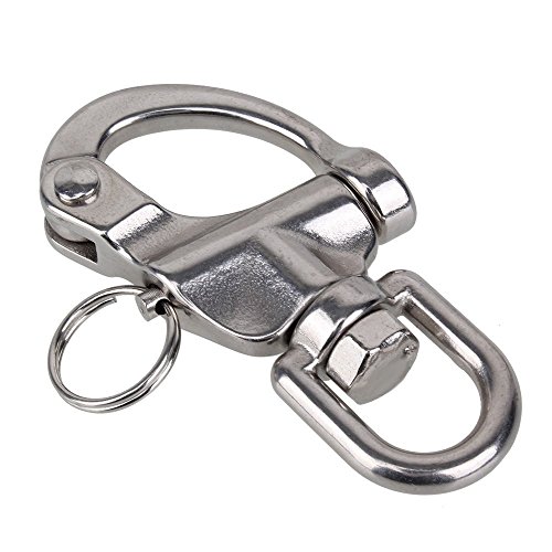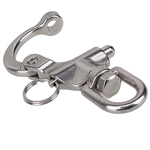 Brand new stainless steel swivel eye snap shackles with warranty, which is highly polished finish for outstanding corrosion resistance and smooth jam-free operation. . This Snap Shackle is designed for maximum strength with smooth, jam-free operation. Its enlarged thoroat and hinge area handles shaer and twisting movement effectively. The smooth shackle arc prevents jamming against pad eyes or sail grommets to permit easy attachment and release.Pull pins have heavy-duty springs to resist accidental openings. This snap shackle measures 2-1/2″ in length and has a breaking strength of 2100lbs.