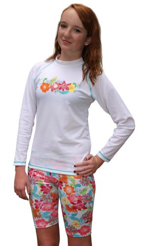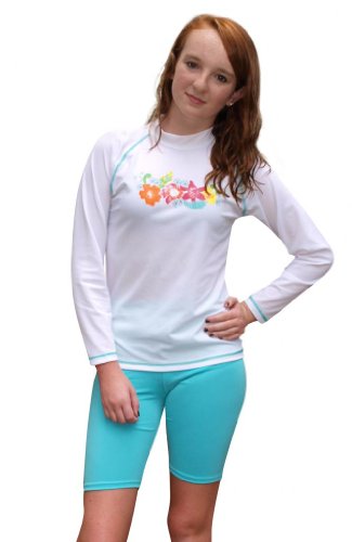 This white floral girl’s 2-piece UV Swimsuit has a long sleeve rash guard top and your choice of turquoise or floral matching swim shorts. Chlorine and saltwater resistant & 100% Polyester. It offers maximum protection of 50+SPF/UPF. Blocks over 98% of UVA & UVB rays, the maximum protection available. Designed by Sun Emporium in Australia, one of the leaders in sun protection. Great for the beach, water parks, the pool and anywhere sun protection is needed. Sizes 4 to 14. Sets are made to fit snugly for comfort in the water, so for a looser fit, go up one size.