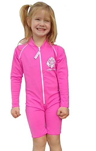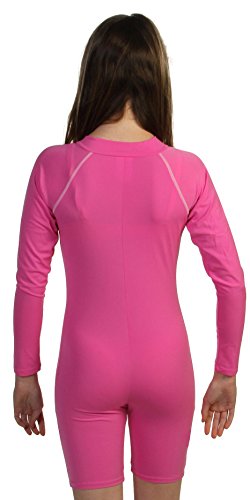 This pink girl’s long sleeve UV Swim Suit is Chlorine and saltwater resistant & 100% Polyester. It offers maximum protection of 50+SPF/UPF. Blocks over 98% of UVA & UVB rays, the maximum protection available. Designed by Sun Emporium in Australia, one of the leaders in sun protection. Great for the beach, water parks, the pool and anywhere sun protection is needed. Sizes 2 to 12. Designed to fit snugly for comfort in the water, so for a looser fit, go up one size.