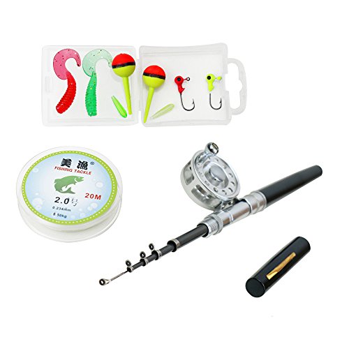 Fully equipped,the item including a pen fishing rod, a fly fishing reel,20m/65.61ft clear nylon fishing line and a box of fishing tackle,the box including 2 * fishing floats, 2 * jig hooks, 2 * soft lures etc.